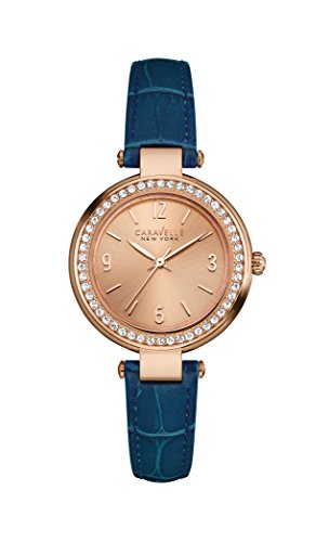 Best Seller! Caravelle New York Rose Gold Mini T Bar Women's Quartz Watch with Rose Gold Dial Analogue Display and Blue Leather Strap 44L178 Review