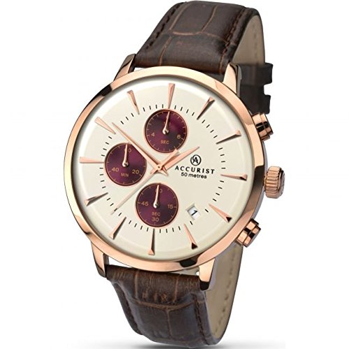 This men's Accurist London watch is made from PVD rose plating and is fitted with a chronograph quartz movement. It is fastened with a brown leather strap and has a cream dial. The watch has a date function.