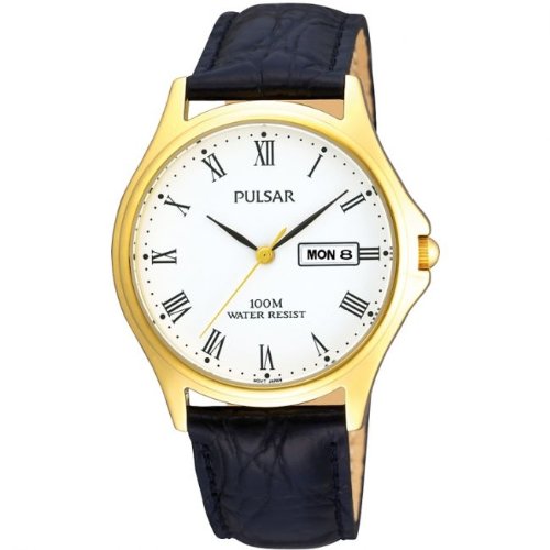 Mens Pulsar watch with an elegant PVD gold-plated case and a simple black leather strap. Further features include day and date functions, plus Roman numeral hour markers.